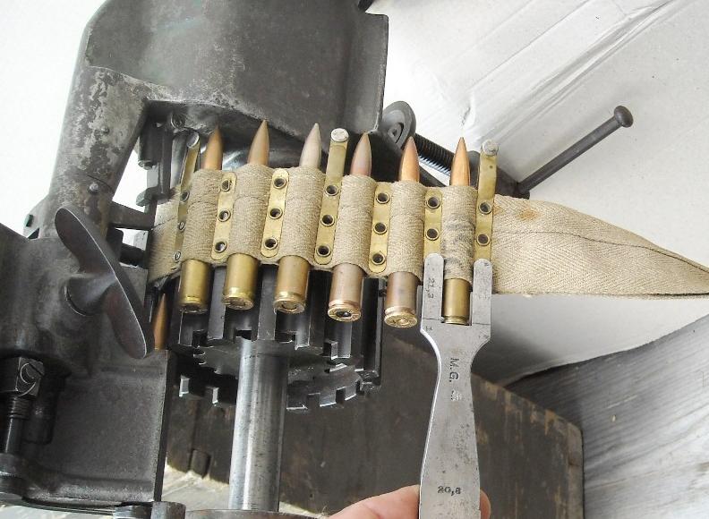 | Gurt eingelegt, teilw. befüllt. Lehre zur Prüfung der korrekten Eindrücktiefe der Patronen |